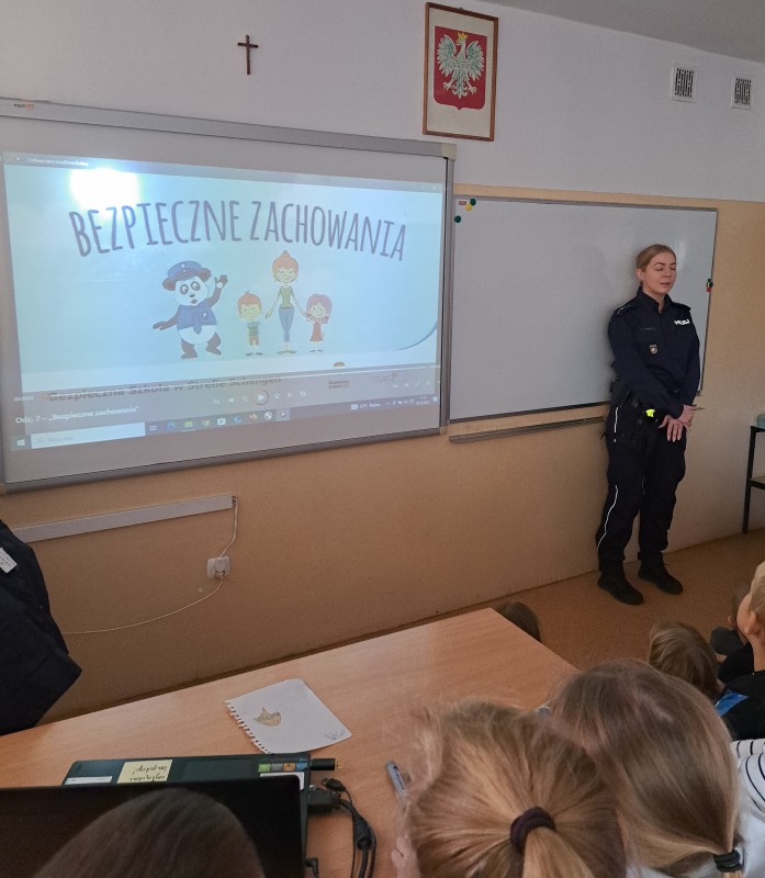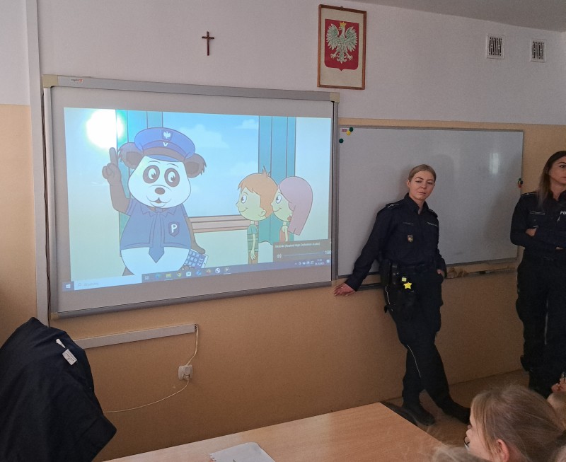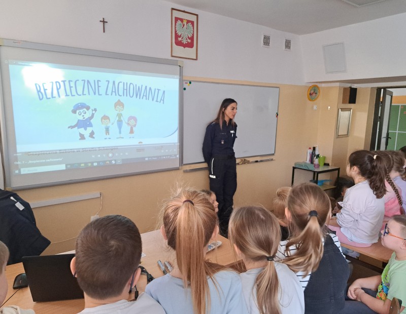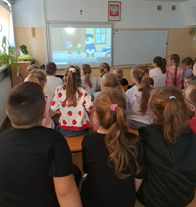 Podczas spotkania policjantki przypomniały najmłodszym zasady bezpiecznego poruszania się przez jezdnię, dlaczego należy nosić elementy odblaskowe. Dzieci obejrzały także film edukacyjny, który w ciekawy sposób utrwalił omawiane treści. Szczególną uwagę zwrócono na sytuacje, w których uczniowie mogą spotkać osoby nieznajome – jak rozpoznać zagrożenie i jak właściwie zareagować.