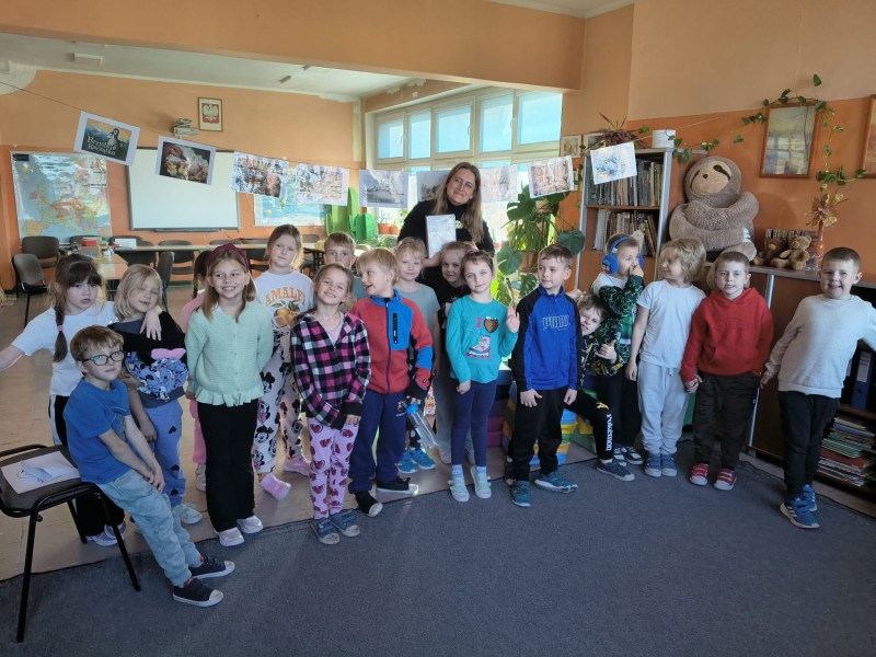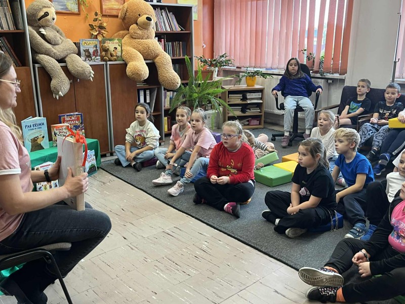 Uczniowie wysłuchali utworu "Skarga książki" autorstwa Jana Huszcza, na podstawie którego omawialiśmy zasady dbania o książki. Pierwszoklasiści chętnie uczestniczyli w rozmowie i brali czynny udział w zagadkach dotyczących książek i postaci z bajek.