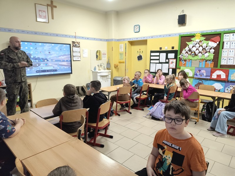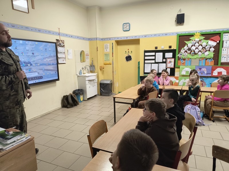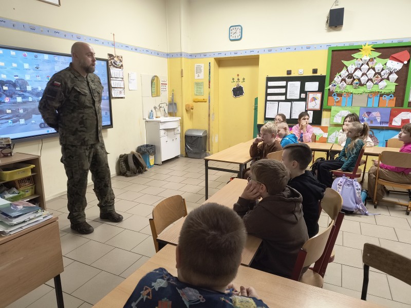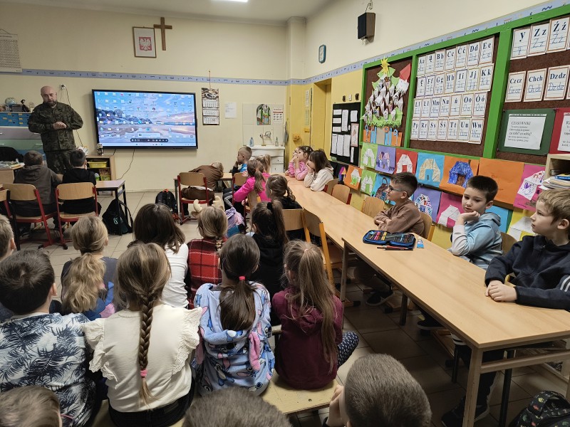 W trakcie spotkania żołnierz opowiedział uczniom o stopniach wojskowych. Dzieci dowiedziały się, że w wojsku wyróżnia się trzy podstawowe stopnie: szeregowego, podoficera oraz oficera. W ciekawy i zrozumiały sposób wyjaśnił, jakie obowiązki wiążą się z każdym z nich. Następnie żołnierz opisał, jak wygląda typowy dzień pracy w wojsku. Dzień rozpoczyna się od sprawdzania obecności, a następnie półgodzinnego rozruchu. Kolejnym punktem dnia jest apel, podczas którego omawiane są zadania do wykonania. Zajęcia trwają od 2 do 6 godzin, po czym żołnierze wracają do jednostki i mają krótką przerwę. Praca może odbywać się m.in. w garażach jednostki zmotoryzowanej lub na poligonach.