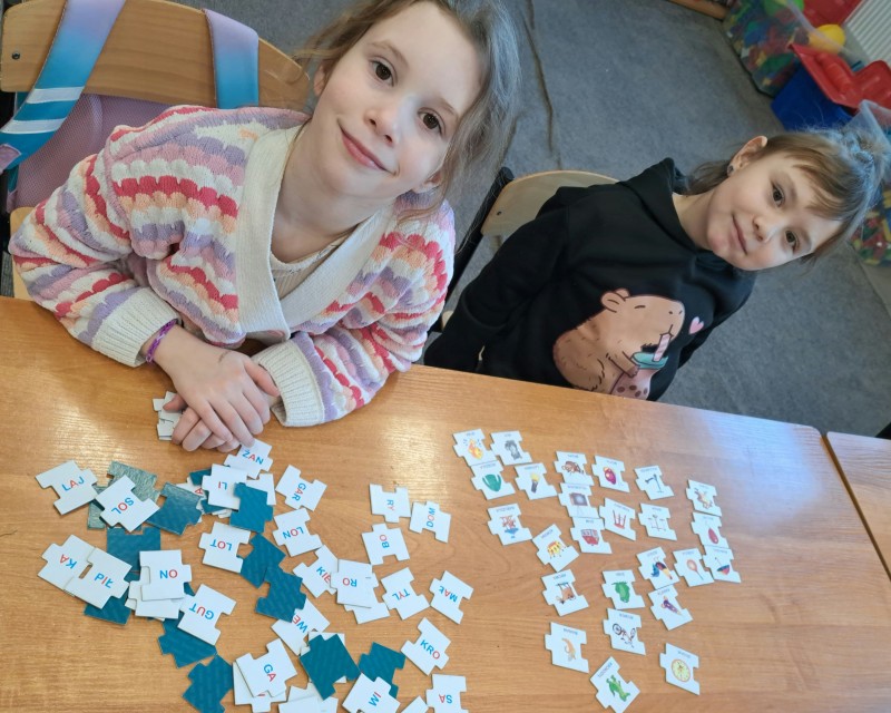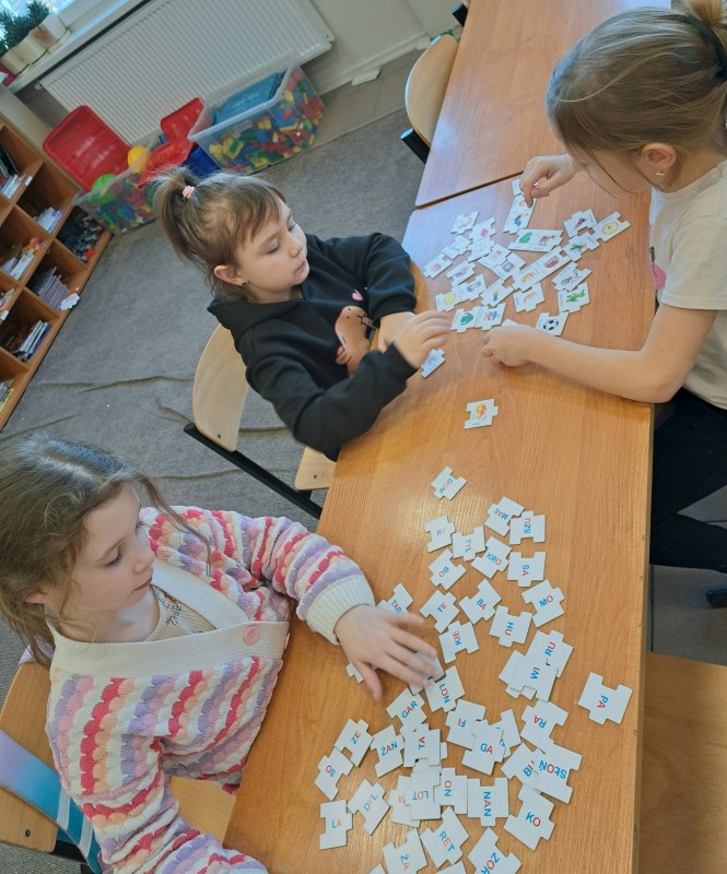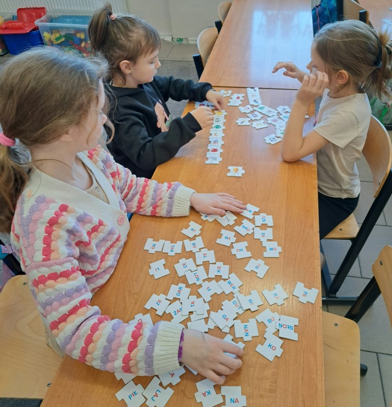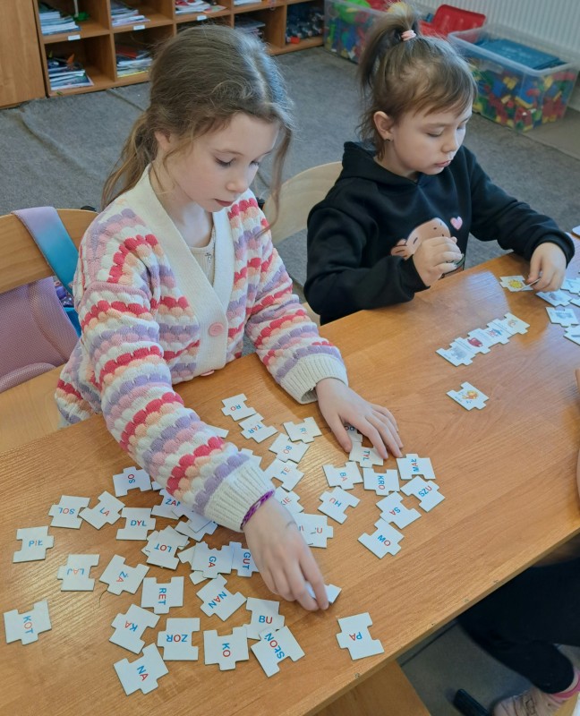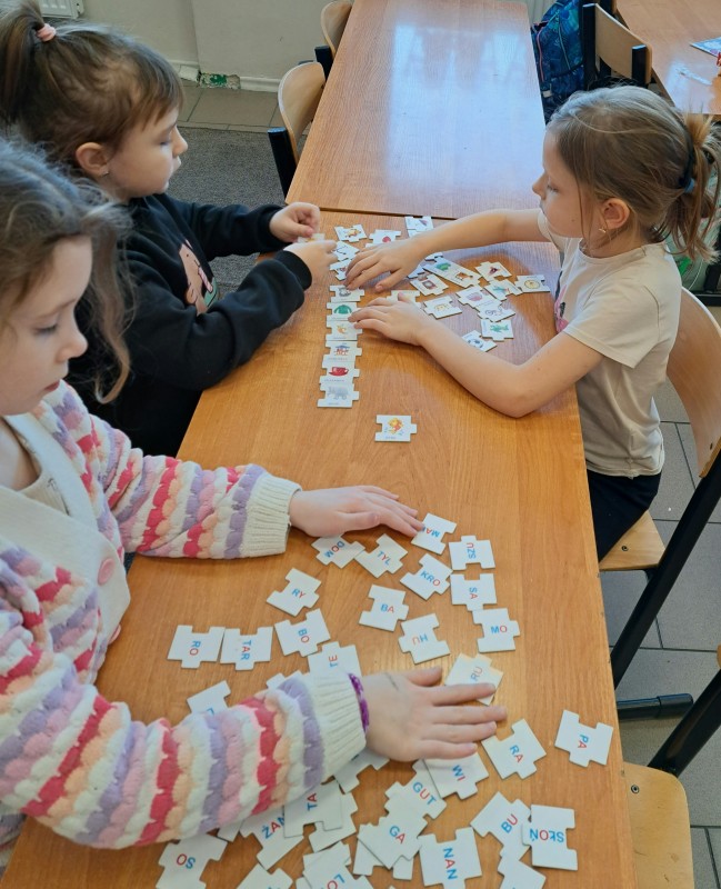 Podczas zajęć "W świecie liczb i liter" realizowanych w projekcie "Zespół Edukacyjny w Skwierzynie - Równy Start II", który jest współfinansowany z Europejskiego Funduszu Społecznego Plus, uczennice utrwalały podział wyrazów na sylaby. W tym celu została wykorzystana edukacyjna gra sylabowa.