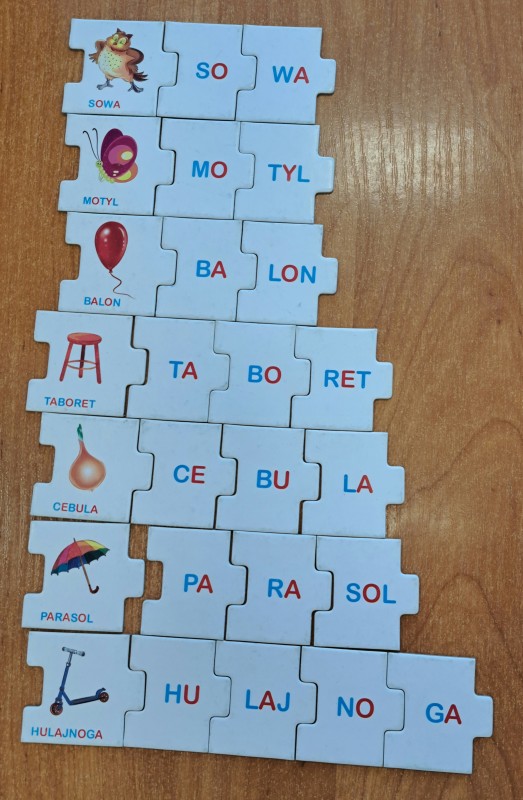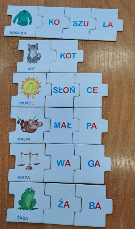 Gra polegała na losowaniu obrazków w kształcie puzzli i szukaniu puzzli z sylabami tworzącymi wyrazy - obrazkowe puzzle do czytania. Gra ta wspiera naukę czytania, analizę i syntezę słuchowo-wzrokową oraz motorykę małą. Polega na łączeniu sylab w całość, tworząc nazwy przedmiotów znajdujących się na obrazkach.