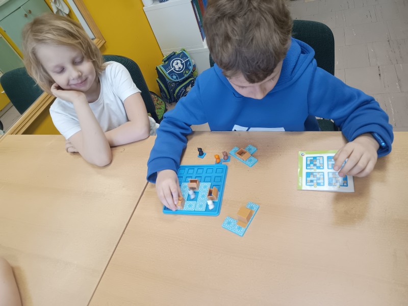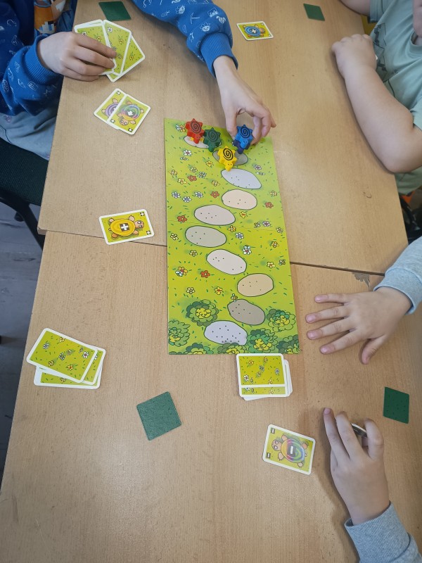 Żeby uatrakcyjnić zajęcia, często zmieniamy aktywności i gry, dlatego na kolejne zajęcia dzieci wybrały grę "Pędzące żółwie". Każdy uczeń podczas pokonywania pól przybliżających go do sałaty musiał powtórzyć wylosowane słowo z głoską, która wymaga utrwalenia. Podczas zajęć było dużo śmiechu i zabawy.