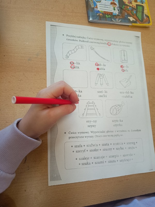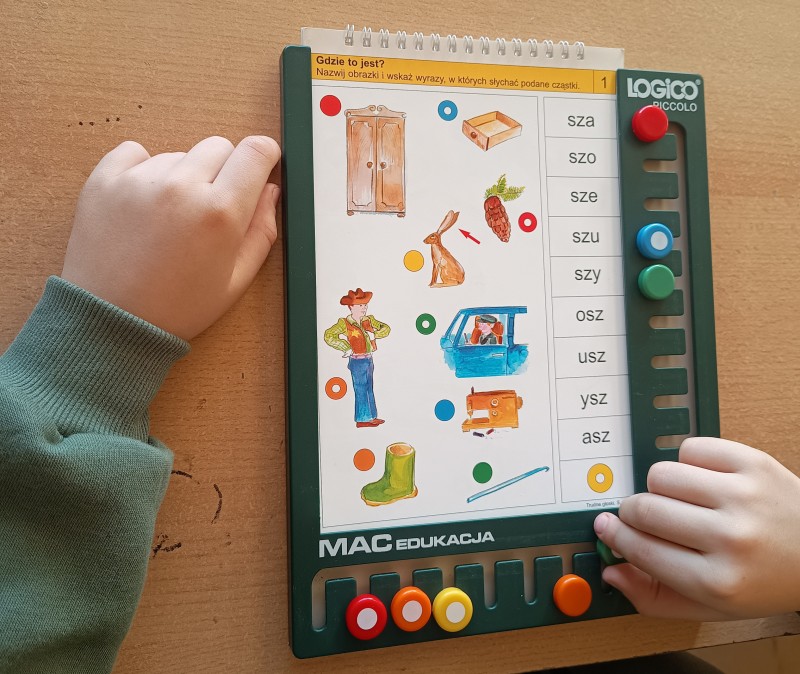 W ostatnim czasie podczas zajęć logopedycznych uczniowie utrwalali prawidłową wymowę głosek szeregu szumiącego. Graliśmy w "Spadające małpki", które cieszą się dużym zainteresowaniem. Przed każdym wyciągnięciem patyczka uczeń musiał poprawnie powtórzyć słowo zawierające utrwalaną głoskę np. szafa, szelki, szalik, czapka.