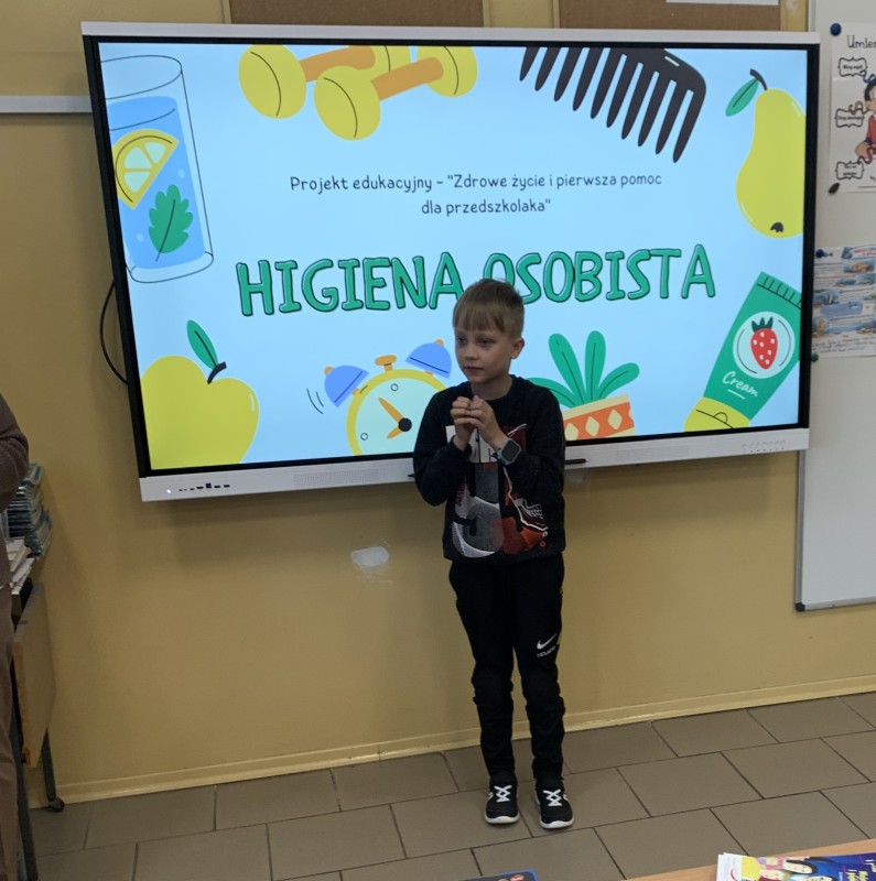 W ramach realizacji projektu uczniowie obejrzeli również prezentację multimedialną, która w przystępny i atrakcyjny sposób przybliżyła zasady codziennej higieny oraz ich znaczenie dla zdrowia. Materiał wizualny pozwolił lepiej zrozumieć omawiane zagadnienia i utrwalić wcześniej zdobyte informacje.