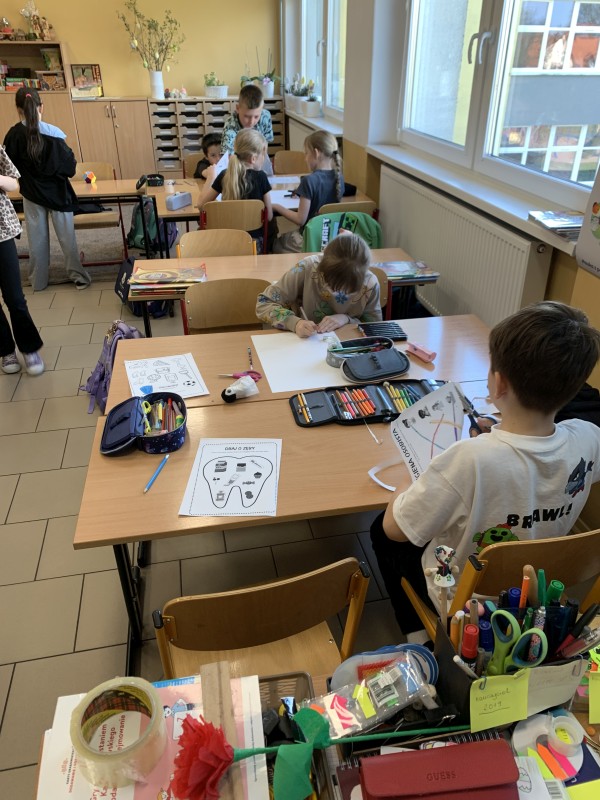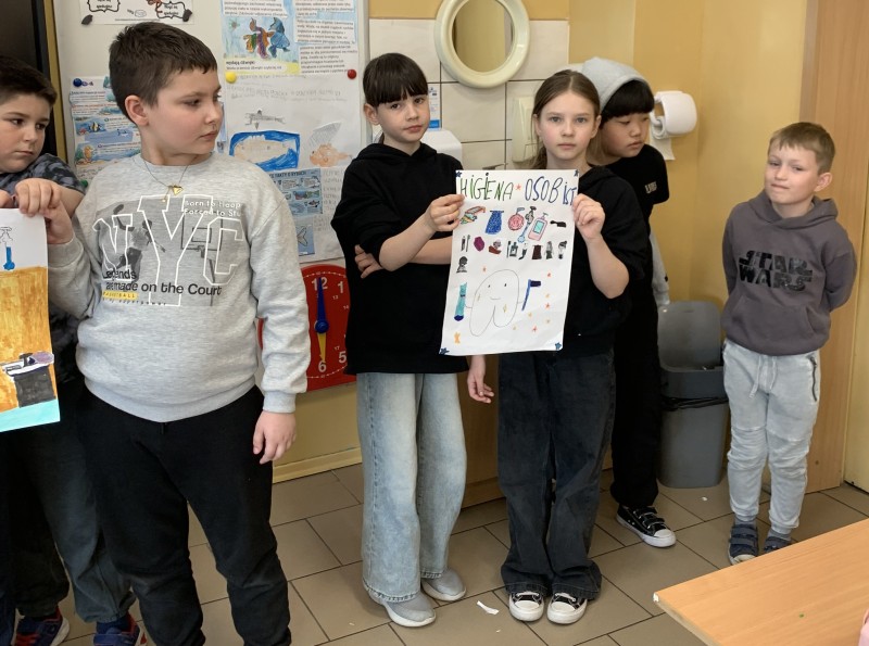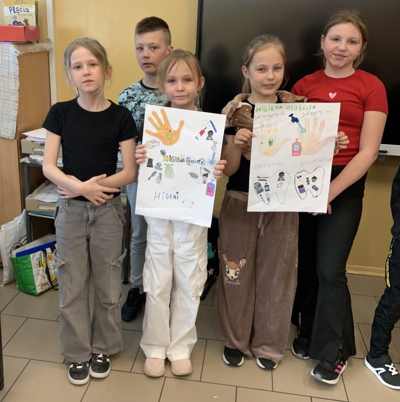 Kolejnym etapem była praca w grupach, podczas której uczniowie przygotowywali plakaty przedstawiające zasady utrzymania czystości w łazience. Uczestnicy projektu wykazali się kreatywnością, współpracą oraz zaangażowaniem. Powstałe prace zawierały najważniejsze informacje dotyczące higieny oraz estetyczne przedstawienie zasad dbania o porządek. Zajęcia miały charakter aktywizujący – uczniowie chętnie uczestniczyli w ćwiczeniach praktycznych, co pozwoliło im utrwalić zdobytą wiedzę i umiejętności oraz rozwijali umiejętności pracy zespołowej.