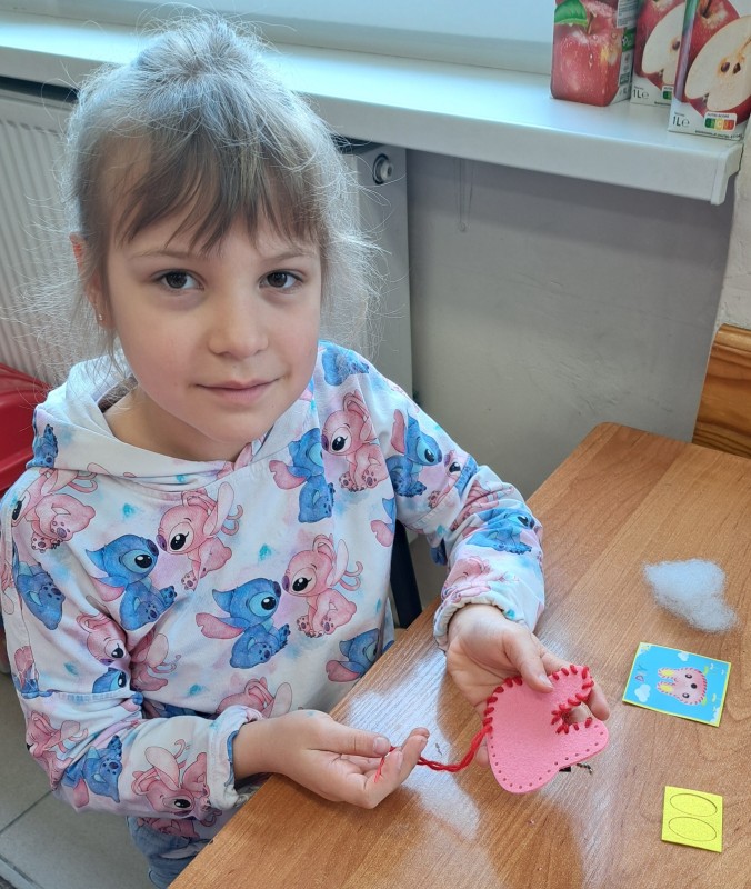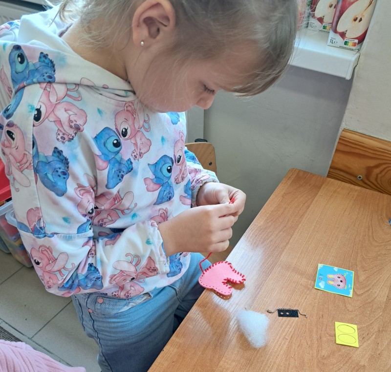 Prace wykonywane były z kolorowej, miękkiej wełny, co sprzyjało ćwiczeniu precyzji ruchów dłoni. Dzieci samodzielnie nawlekały nitkę na plastikową igłę, a następnie zszywały ze sobą poszczególne elementy. W dalszej części zajęć doklejały dodatkowe detale, takie jak uszy czy oczy, nadając swoim pracom indywidualny charakter.